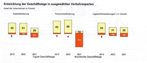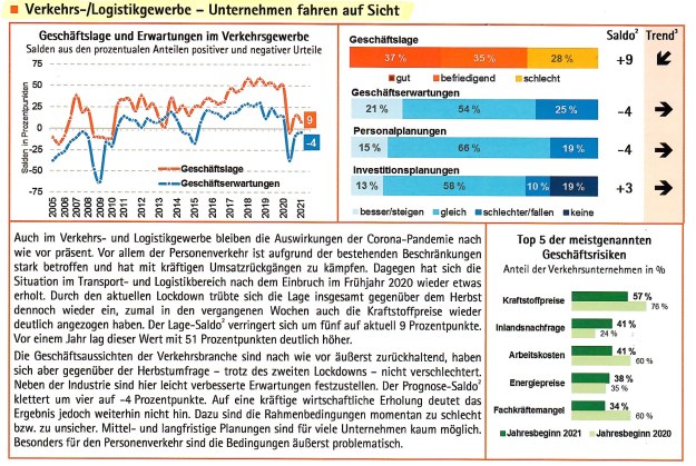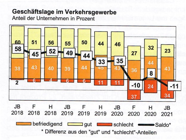 Die Geschäftslage der Verkehrsgewerbe ist dramatisch gesunken. Waren es im Vorjahr 2020 46%, so schätzen lediglich 23% der Befragten ihre Lage gut ein. Mehr als ein Drittel, im Vorjahr nur 11%, beurteilen ihre Lage nun als schlecht. Der Saldo erreicht mit -11 Punkten das niedrige Niveau vom Frühling des Vorjahrs. Die aktuelle Tendenz der Auftragseingänge liegt bei -42 Punkten ebenfalls deutlich unter dem ohnehin niedrigen Vorjahresniveau von -8 Punkten und bietet aufgrund der aktuellen Corona-Beschränkungen wenig Grund zur Hoffnung auf Besserung.