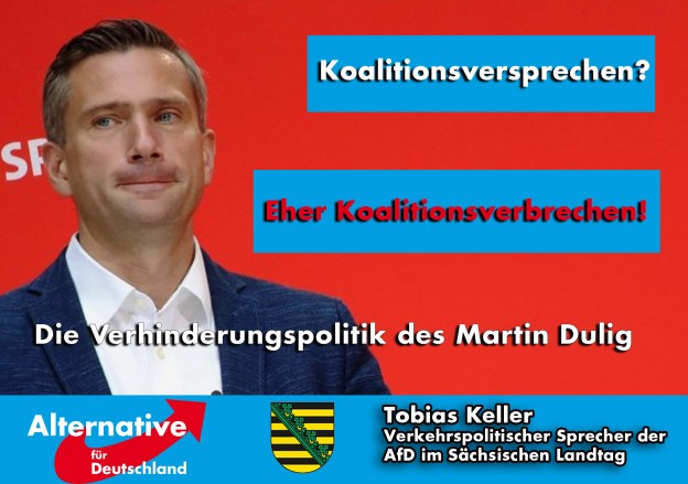 Politik für den Bürger geht anders. Die AfD mahnt dringend, dass Herrn Dulig „auf den Zug der Bevölkerung aufspringt“, damit Sachsen in Zukunft nicht „abgehängt“ wird. Sonst sehen wir Konsequenzen entgegen, denen man weder zeitnah, noch kostengünstig entgegenwirken kann. Der Leidtragende ist in diesem Fall, wie immer, der Bürger.